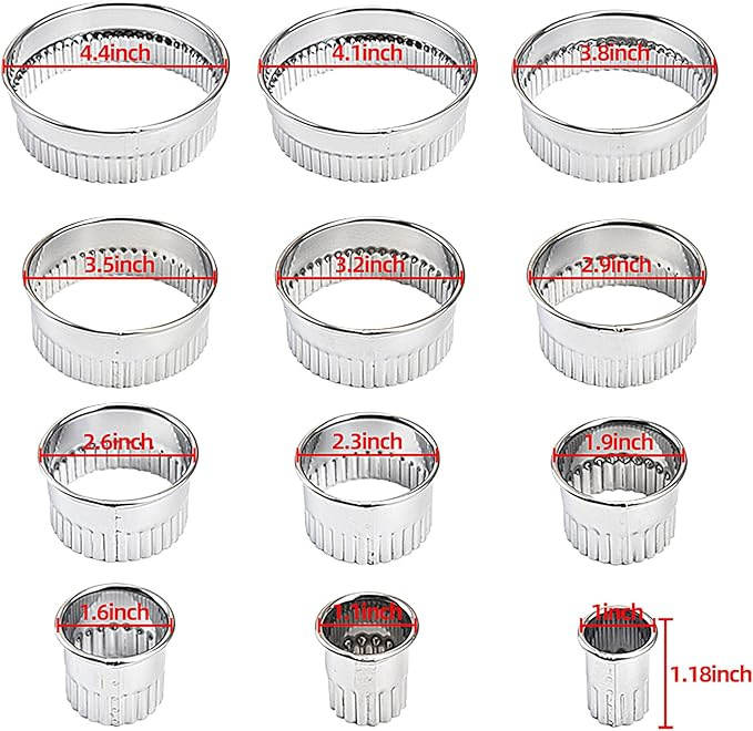 12 Pcs BISCUIT CUTTER SET] 12 pcs donut hole cookie biscuit cutter set for baking, diameter are: 1.0 in/2.6 cm, 1.1 in/3.3 cm, 1.6 in/4.2 cm, 1.9 in/5.0 cm, 2.3 in/6.0 cm, 2.6 in/6.8 cm, 2.9 in/7.5 cm, 3.2 in/8.2 cm, 3.5 in/9.0 cm, 3.8 in/9.8 cm, 4.1 in/10.5 cm, 4.4 in/11.3 cm. High: 1.18 in/3cm for all.[HIGH-QUALITY STAINLESS STEEL]This biscuit mold is made of 304 stainless steel, will not rust, does not stick to dough, and is easy to clean.[Wave Round Cookie Cutters]This mold creates fancier cookies, breads, sandwiches, fudge, craft clay, as well as omelettes and pancakes.[Safe to Use]The top edge of this set of cookie cutters is designed with a rolled edge to protect your fingers from injury during use.[Great Gift]A great gift for your friends who love cooking. This cookie cutter is easy to store and saves space, you're sure to get their appreciation.
